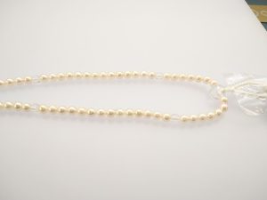 アコヤ真珠(5.5mm~6.0mm)の本連念珠の一部の写真です。水晶の親珠と四天の珠が入っています。