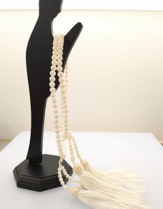 白い珠はアコヤ真珠・珊瑚・水晶で。お房のお色も白だけでなく紫色などもよろしいかとも思いますが、無難であるのは白色です。そして、片手(あるいは略式とも言いますが)の念珠ではなく、本連(108の珠と四個の小さめの珠と両側にある大きな珠二個で成る)の念珠で!