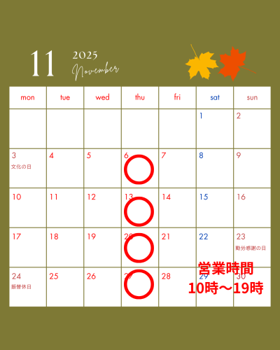 木曜日が定休日になります。11月6日・13日・20日・27日がお休みです。
