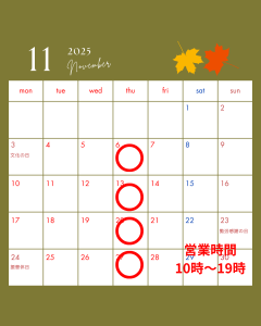 木曜日が定休日になります。11月6日・13日・20日・27日がお休みです。