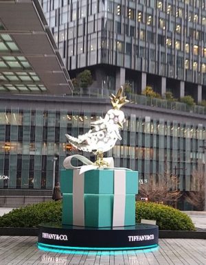 駅前のデパートのテラスには、こんなオブジェがありました。ティファニーの『バード オン ア ボックス』
