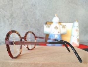 2本とも丸型とか楕円形とは少々違って、よーーく見ると角度がついた個性的な形になっています。またフロント部分はマーブル模様のように多くの色が使ってあり、それが優しげで柔らかなニュアンスを醸し出します。上品な感じで掛けたいし、でも少しだけ個性的な印象も欲しい。そんなメガネをお探しのマダムにおススメしたいフレームです。