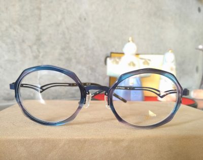 2本とも丸型とか楕円形とは少々違って、よーーく見ると角度がついた個性的な形になっています。またフロント部分はマーブル模様のように多くの色が使ってあり、それが優しげで柔らかなニュアンスを醸し出します。上品な感じで掛けたいし、でも少しだけ個性的な印象も欲しい。そんなメガネをお探しのマダムにおススメしたいフレームです。