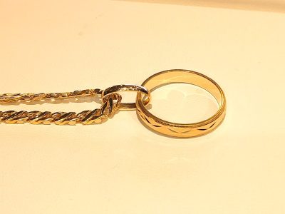 指輪を鎖に通す。簡単に言えば、そのまま指輪を鎖に通せばいい。