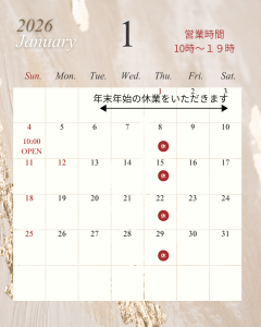 2025.12.29 1月の営業のご案内です 1月の営業のご案内です 1月3日(土曜日)まで年末年始の休業をいただきます。4日(日曜日)から通常通りに営業をいたします。よろしくお願いいたします。 定休日は木曜日 8日・15日・22日・29日になります。 【ジュエリーシバタ】 TEL:058-391-3504 住所:〒501-6244 岐阜県羽島市竹鼻町丸の内3丁目29 営業時間:10:00〜19:00 定休日:木曜日 —– 岐阜県羽島市ジュエリーシバタ ジュエリー・真珠(パール)・時計(ウォッチ)メガネ・修理リフォームの専門店 —– お問合わせは、お電話、もしくはHPの お問合わせフォーム又は、ご来店予約フォームよりお願いします。 Tweet Share Hatena Pocket RSS feedly Pin it 年末年始の営業のご案内です